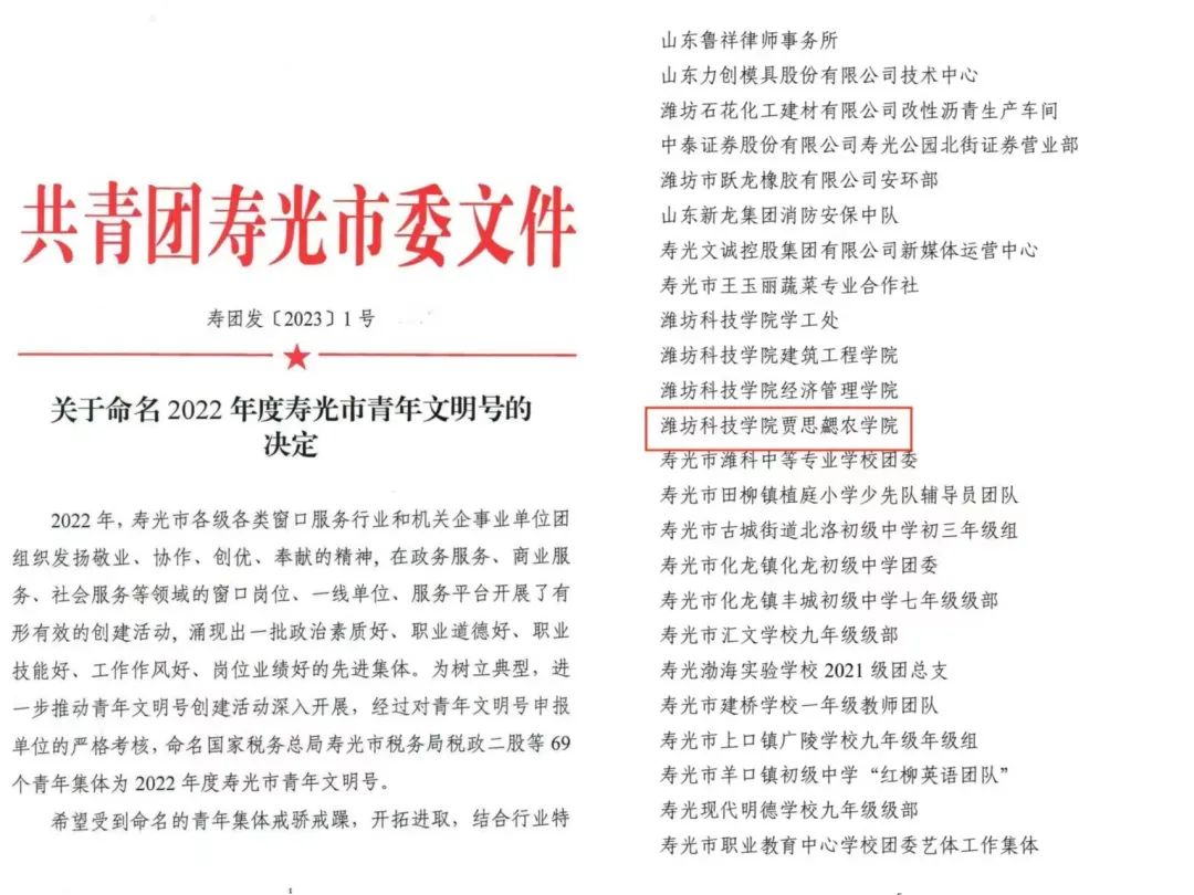 近日,共青团寿光市委印发了《关于命名2022年度寿光市青年文明号的决定》(寿团发〔2023〕1号),我们荣获“2022年度寿光市青年文明号”荣誉称号。